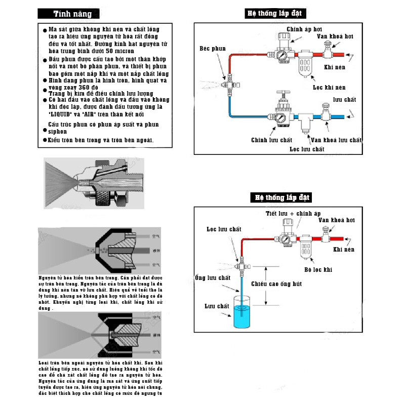 Có thể điều chỉnh tốc độ dòng chảy của chất lỏng và cũng có thể tạo ra tia phun đáp ứng các yêu cầu mà không làm thay đổi áp suất không khí và áp suất chất lỏng, vì vậy nó có khả năng thích ứng mạnh mẽ. Mỗi thiết bị phun bao gồm đường khí và đường lưu chất, có thể tạo ra các kiểu phun hình quạt và hình tròn, và điều chỉnh được dòng chảy. Đầu nối đầu vào của thân vòi có kích thước đa dạng, phù hợp với hầu hết các loại ống thông dụng. Các bộ phận vòi phun ở trên có thể được thay thế cho nhau, mang lại sự linh hoạt để có được các đặc tính phun khác nhau.